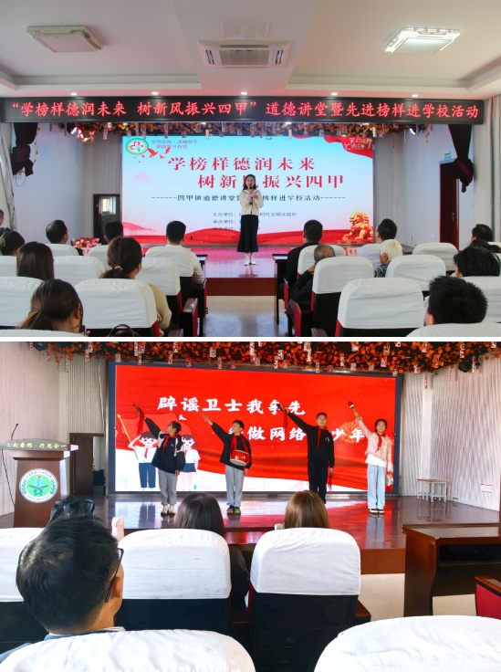 四甲镇网信工作中心走进四甲小学开展“学榜样德润未来 树新风振兴四甲”道德讲堂,活动以“榜样之光·润泽心田”“文明之风·拂润校园”双篇章徐徐展开。活动现场,六三班的学生以铿锵有力的快板节奏拉开《辟谣卫士我争先 争当网络好少年》的表演序幕。四位小演员通过"三句半"的独特形式,将网络谣言的危害、辨别方法及文明上网准则编成朗朗上口的韵律台词,通过艺术化呈现将“不信谣不传谣”从标语化为可践行的行为准则,赢得满堂喝彩。