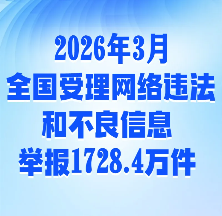 2026年2月,中央网信办举报中心指导全国各级网信举报工作部门、主要网站平台受理网民举报色情、赌博、侵权、谣言等违法和不良信息举报1707.2万件,环比下降22.9%、同比下降3.5%。